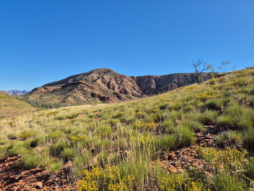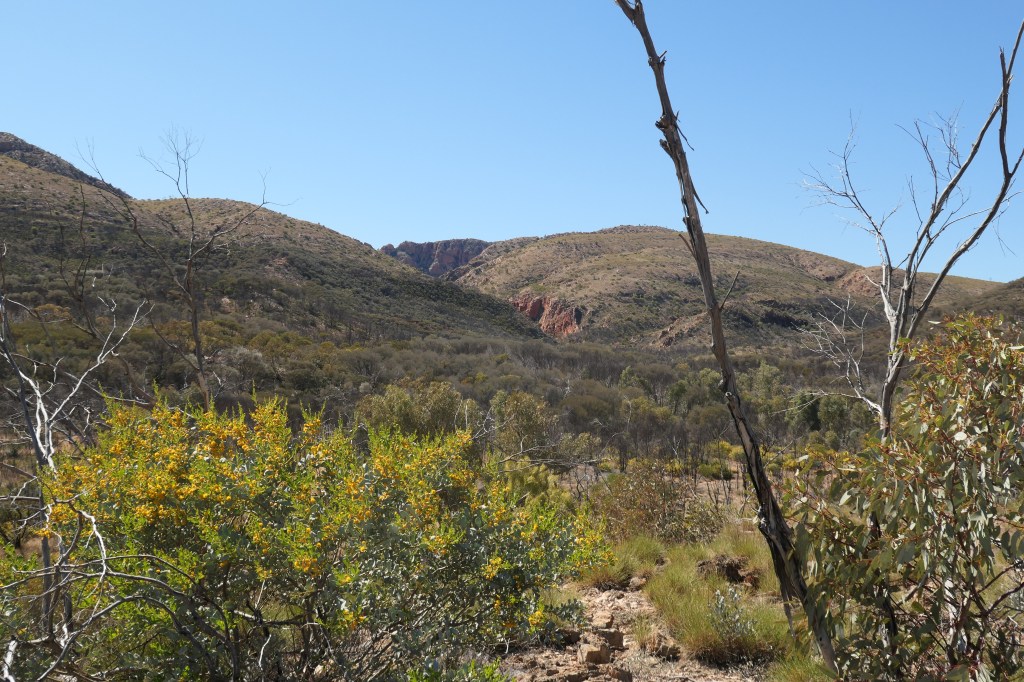 Walking from a rough vehicle track onto the Larapinta trail we enjoy the wide vistas of valleys and gorges, with the Inarlanga pass in the distance. It’s not our plan negotiate this pass as we did when walking the whole trail but to veer South towards the Ochre pits. With the pass behind us we must negotiate rough stoney shale for quite some time to eventually reach our goal. The beautiful views around the pass are made more splendid with masses of Wattle, Senna and wildflowers that are in full bloom.