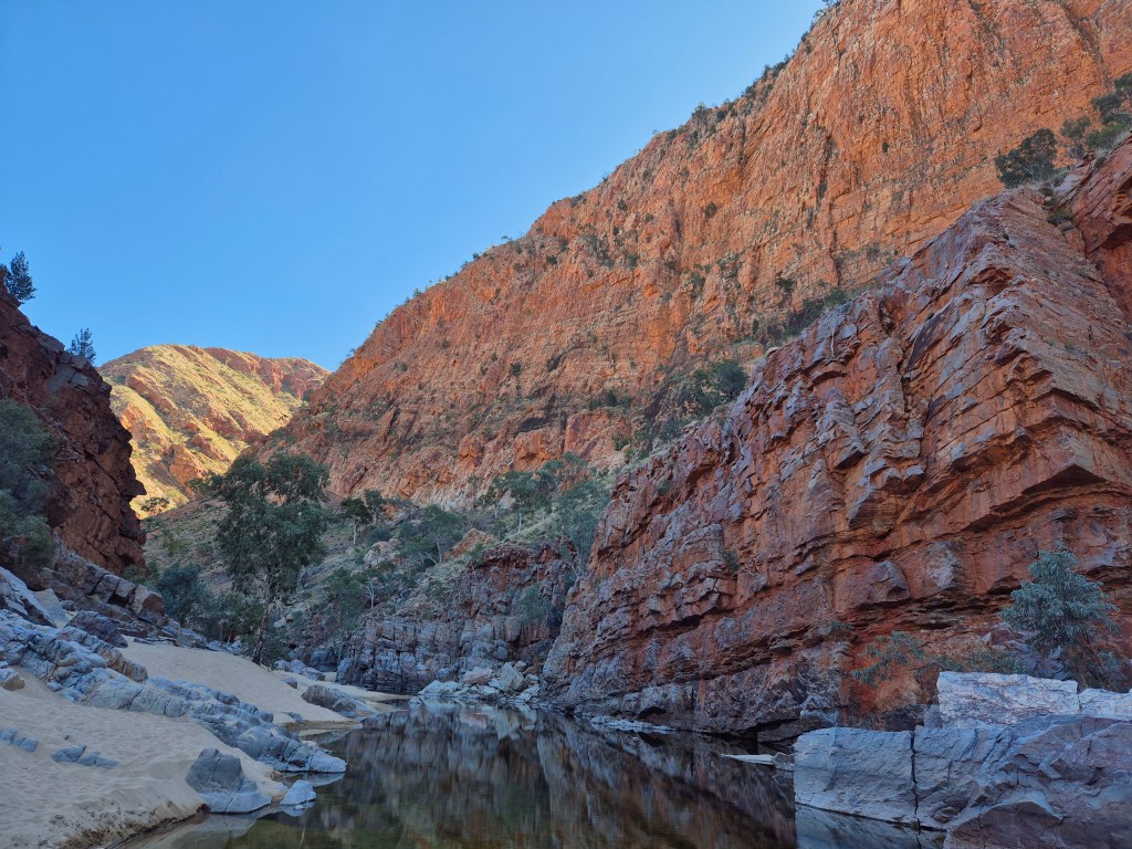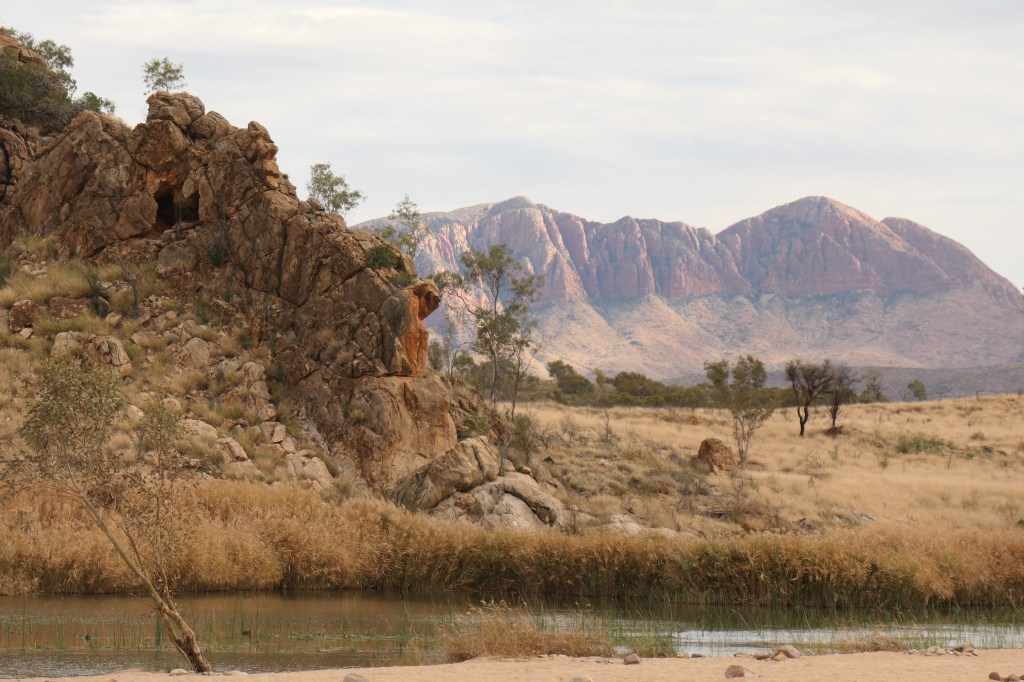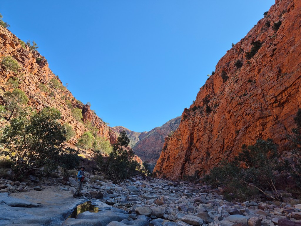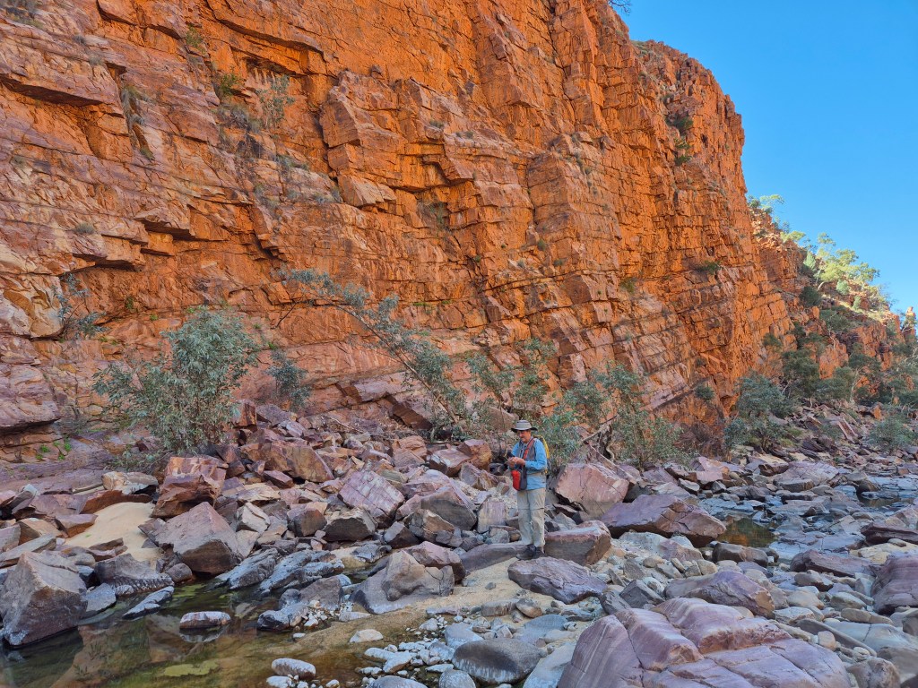 The next day its onto Redbank Gorge where we know we will be camping without vans or many other folks around us. The only amenity here is a pit loo and that’s broken. Food, water, wood and everything else we need have to be brought in for the period of our planned stay. We know from experience that not many people camp for more than a night or two in this area, and certainly those monstrous vans just don’t work here because it’s designed for basic camping only. Folk who pop in, and who are willing to suffer the privations are here for the Mt Sonder ascent, being the end of the famous and wonderful Larapinta trail. Having walked this trail and climbed Mt Sonder many times in the past we will use our precious time for other explorations.