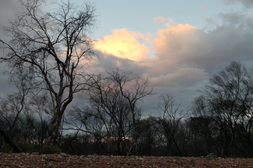 That night clouds return to provide a pretty sunset, off set by the trees burnt from recent fires. These will of course regrow in the next couple of years so all is not lost. The following night we do the traditional thing for us and head out away from camp to watch sunset on the mountains, in this case Mt Sonder.