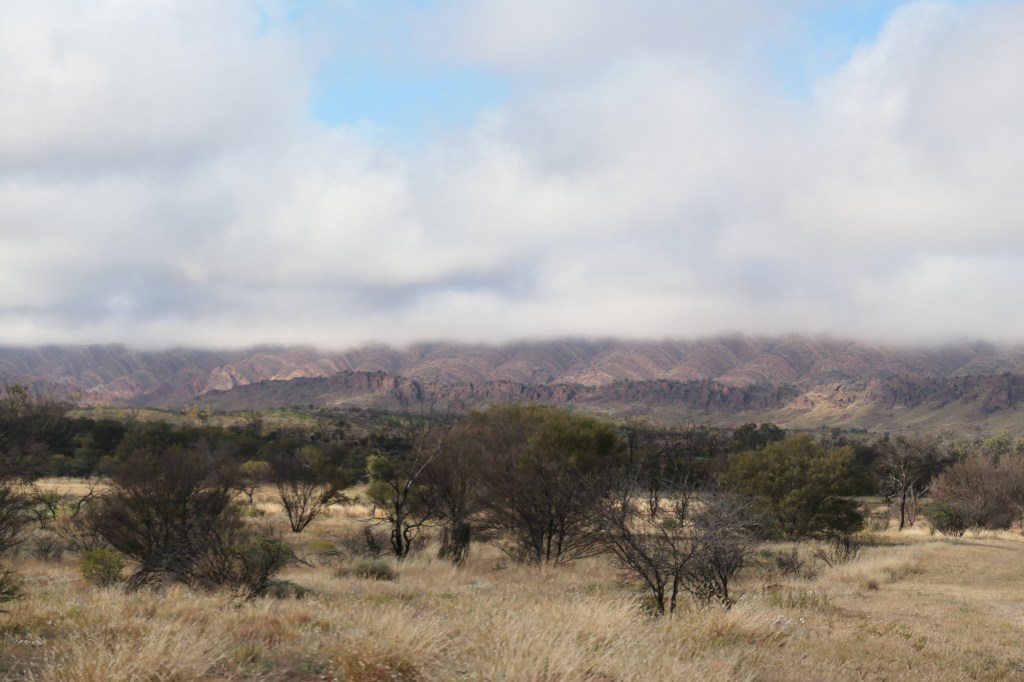 The next day dawns a little cloudy. We have chosen to join the Larapinta trail at the Serpentine Chalet dam, a feature of yesteryear, with a view to reaching the Inarlanga pass. Rather than head through the pass we will veer South towards to Ochre pits which have cultural significance for the local indigenous community. Driving to the take off zone we are greatly surprised to see clouds hanging over the Pacoota range; a feature I have never seen in all my time travelling these areas. Naturally the low clouds clear quickly as the sun rises, but it feels a little eerie.