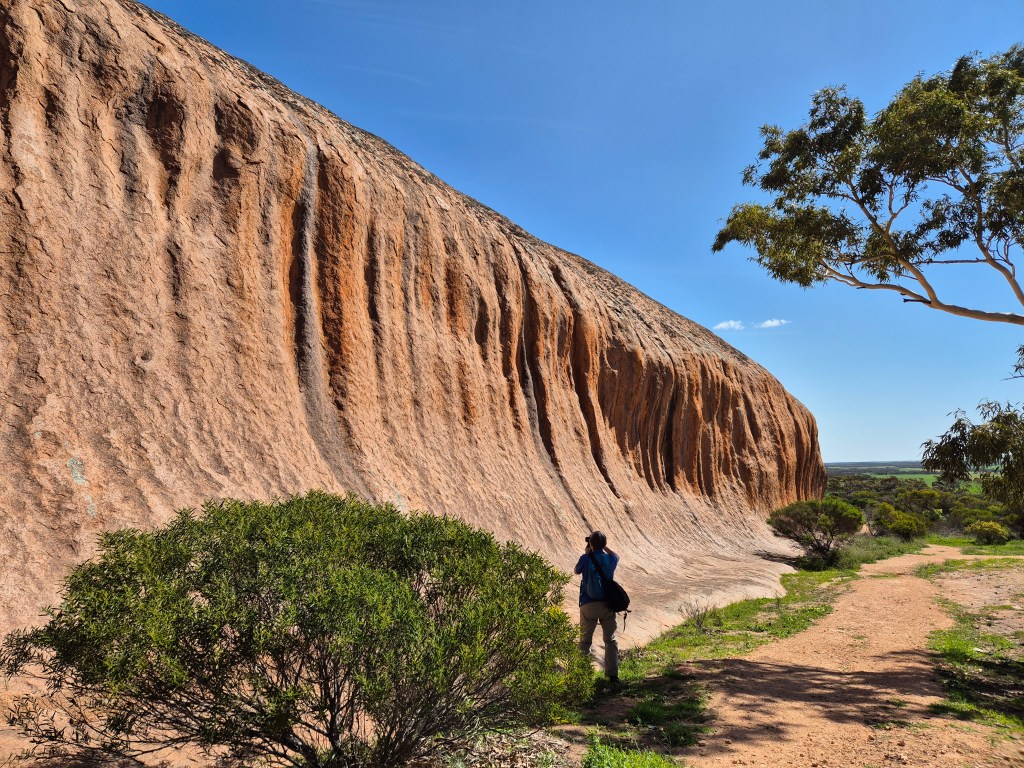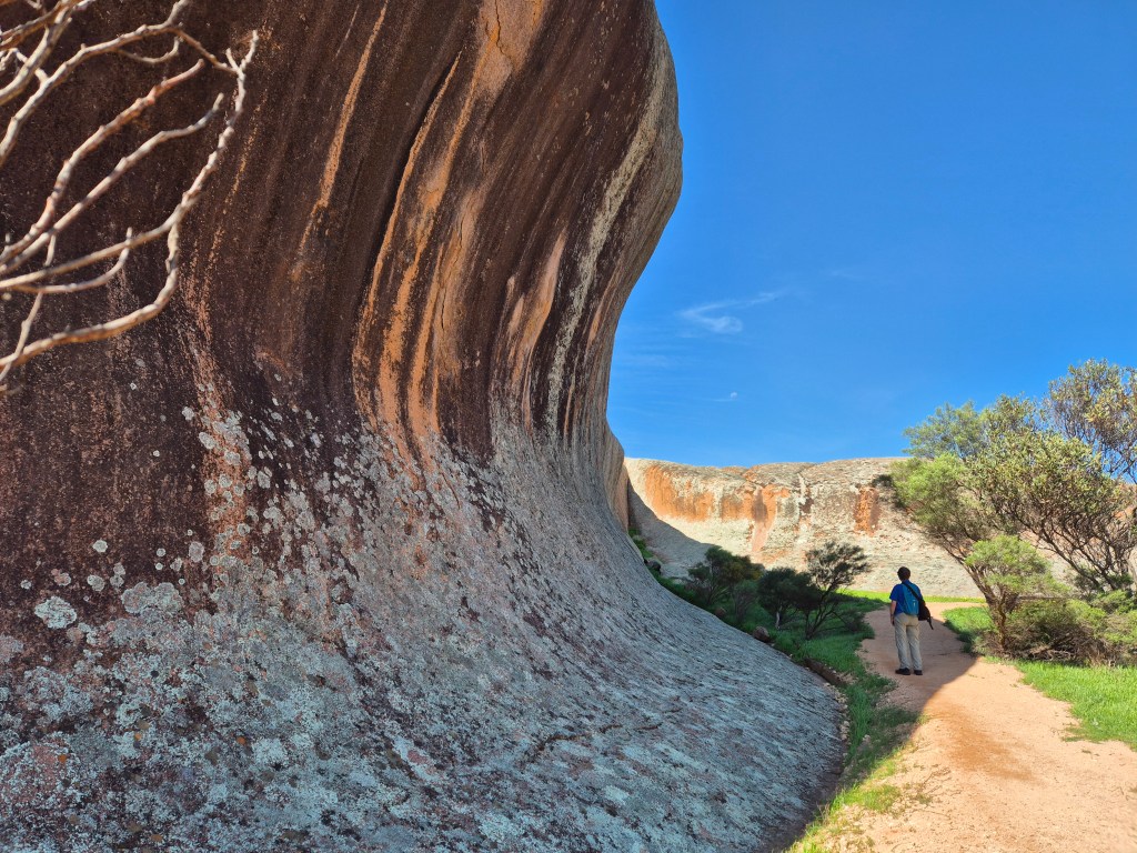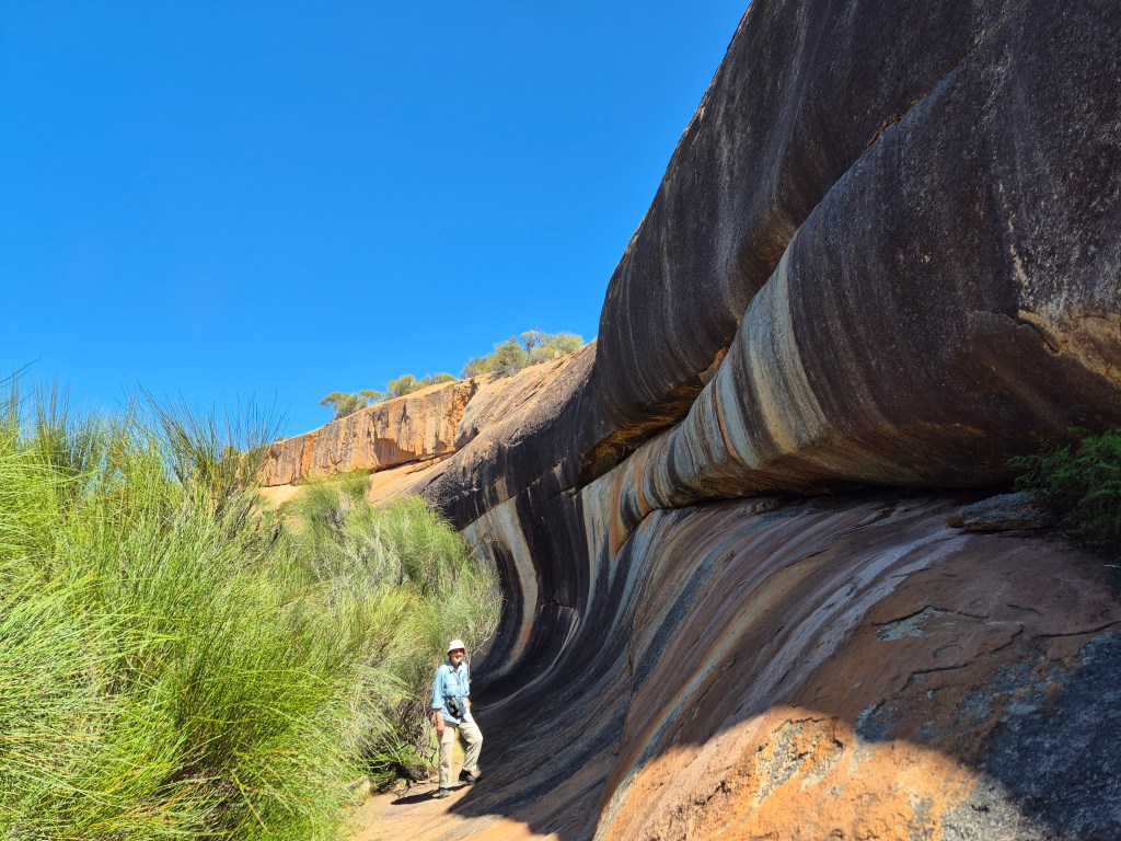 Wave rock is probably one of the most “touristy” granite rock formations. In truth others are just as spectacular but as we are here let’s do it. It is an impressive wave and climbing to the top we see how the local dam gets filled during rainstorms. That rain is again not far off, and we see the very dark band coming our way. So, let’s walk quickly back to the car for protection against the deluge that does indeed dump on us as we drive back to home base. Happily, our tent is still standing.