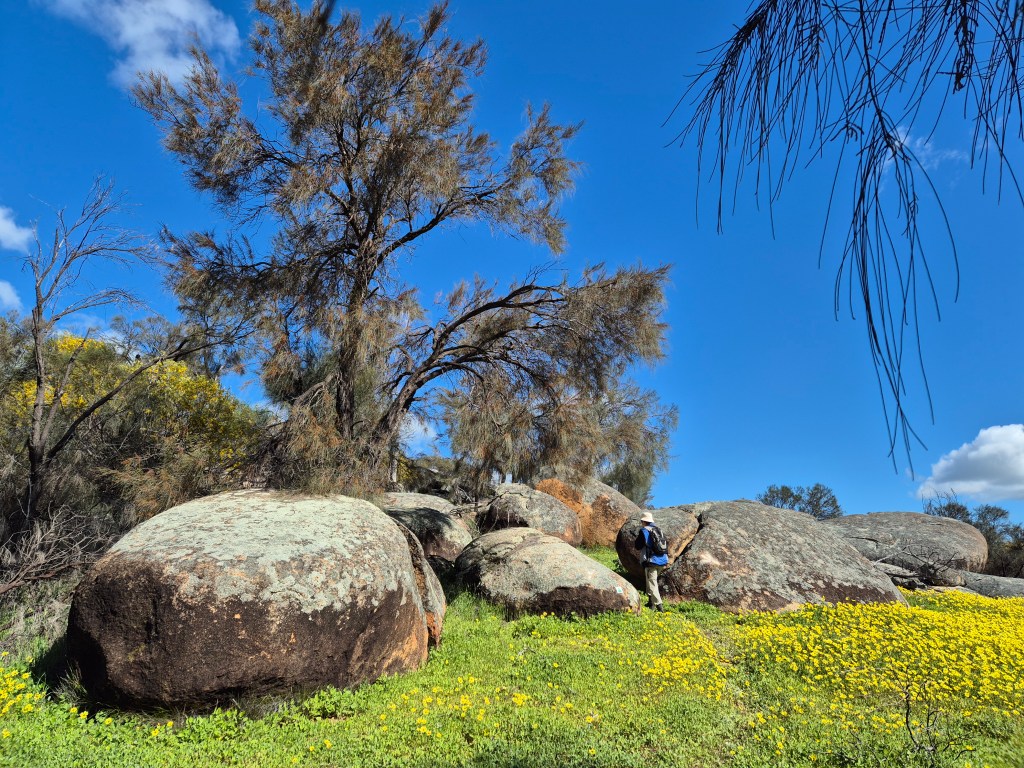 Rain is back on the radar and as we set up camp at Wongan Hills it’s to downpours and mud. Oh well! To complicate matters our goal of visiting Esperance and Albany may require a rethink as the forecast there looks nasty and I have no intention of being wet wet wet every day. We know there are many things to do in this town and surrounds so let’s see how things go over the next wee while. First on the agenda as clouds clear the next day is the Gathercole Nature Reserve. In theory this 2.2km loop trail should be managed quickly. But the wildflowers and birds (yes we are Birders) are so amazing that we spend quite some time roaming around the granite formations and checking out the landscape, wildflowers a