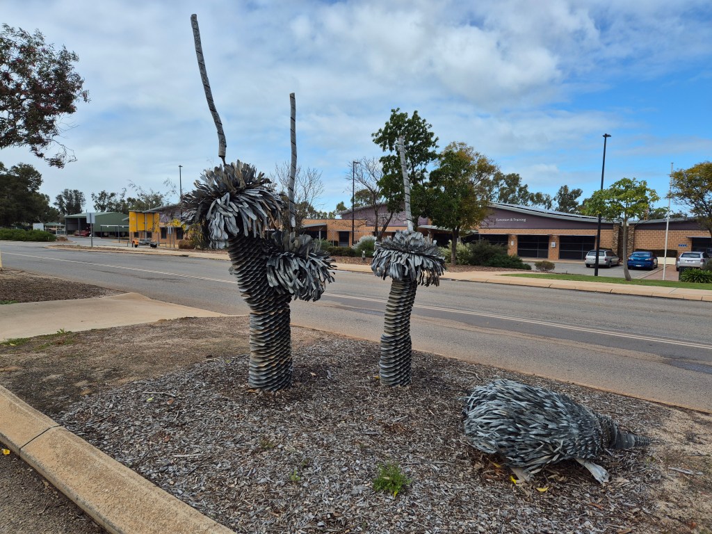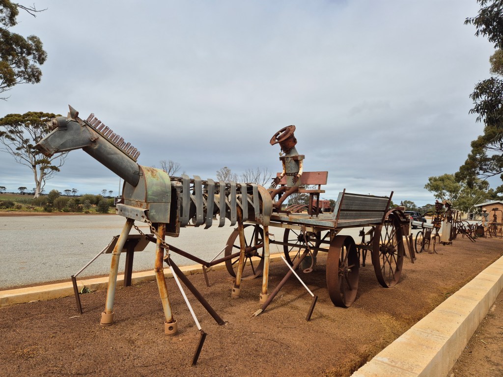 Its probably time to move on, so after 6 nights in Wongan Hills, and much exploration we head further South with a view to visiting Wave Rock. Yes, Esperance and Albany have been given a miss. Wave rock is near the small town of Hyden, which gets much of its water from that massive rock in the same way our forbears collected it in past years. They accomplished this by by putting stone barriers around the edges of the granite dome so that water is channelled into a collecting point of some type…clever. Camping at Kondinin we drive through Hyden where we are delighted to see more art, of a metal variety. Metal art is a “thing” in WA and every township seems to have its own version of it.