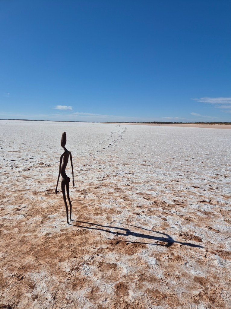 Heading to Sandstone today we passed by Lake Ballard, famous not for its beauty, as its a salt lake, but for the 51 steel statues that are spread throughout. These were created by a British artist called Anthony Gormley to represent the residents of Menzies. To see them all you would need to wander quite a distance over the lake, but we were content to just take some pictures of those that time allowed. Then onto our target digs for the night via a dirt road that required some cleaning of our kit when we arrived.
