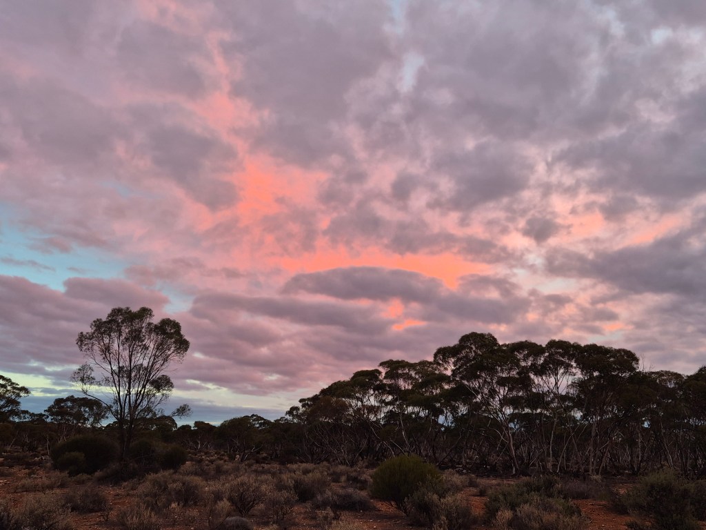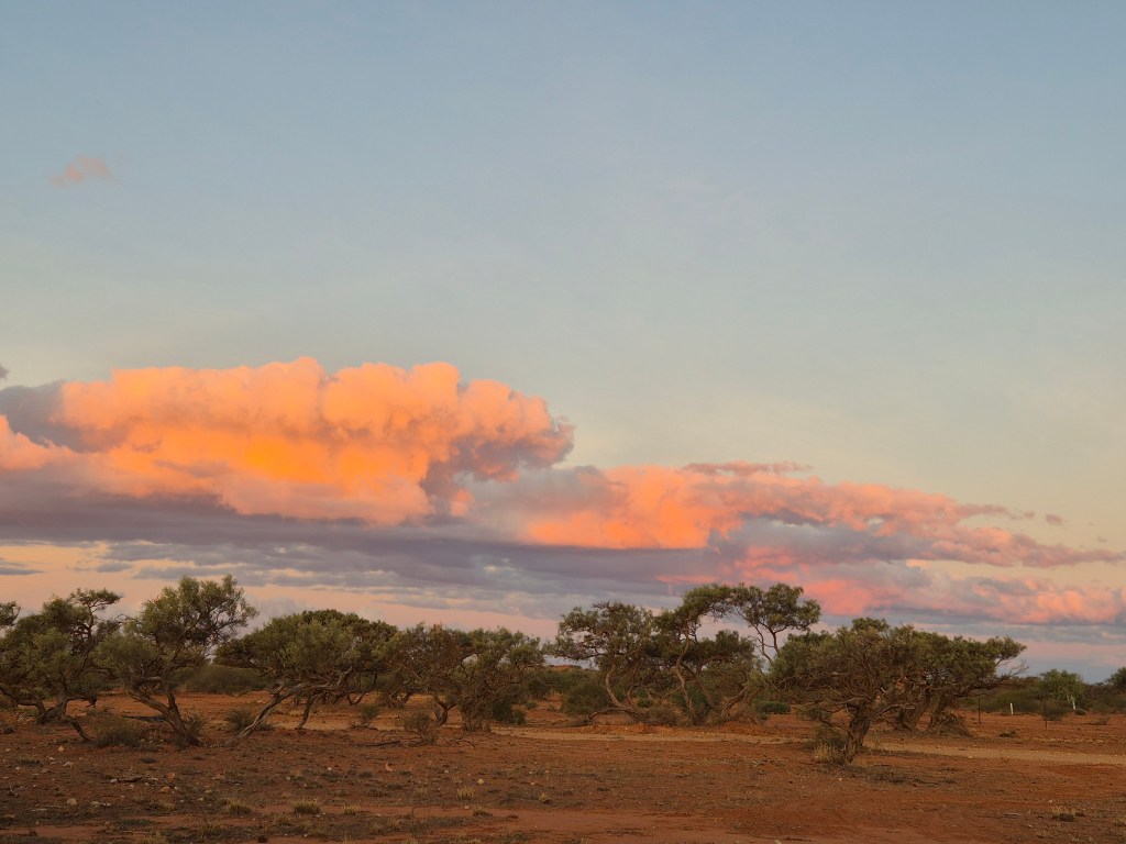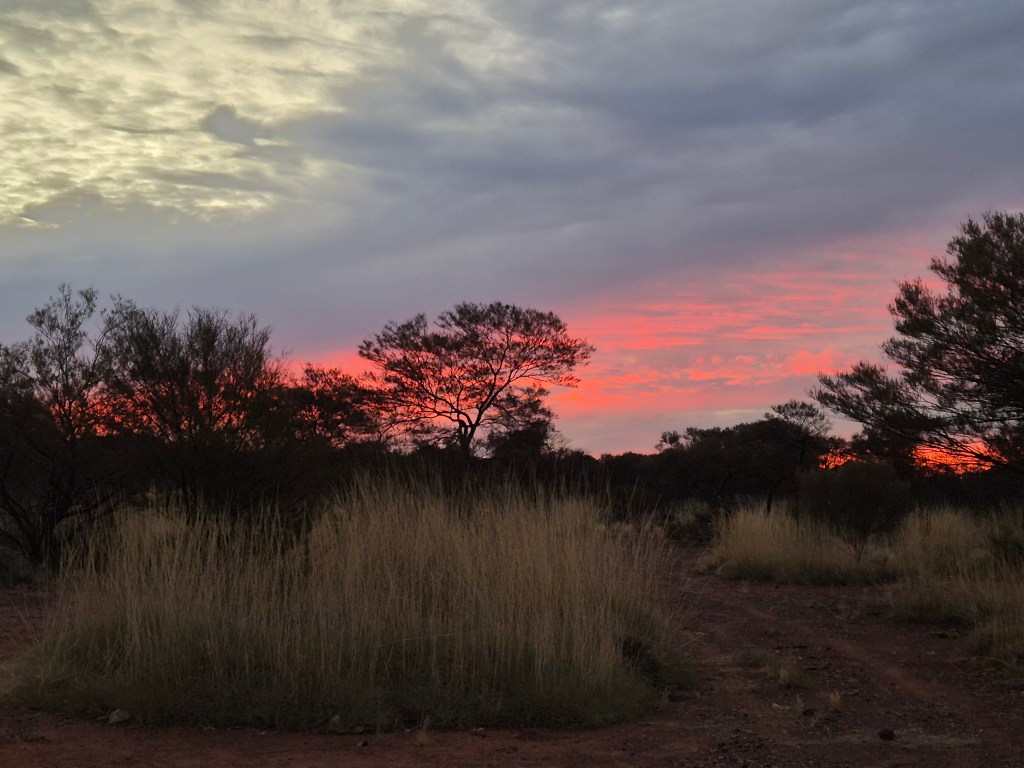 Tonight’s camp is at a rather daggy road house but we are happy as we got in early enough to grab a really nice spot by a creek bed. Then the sunset provided the canvas over tea. As an aside there was plenty of wildlife today, but I was greatly amused by a huge Wedge Tail Eagle trying to be inconspicuous in a tree near the road. It failed as both a Whistling Kite and a mob of Ravens were attacking it vigorously. I figured it would not take long before it capitulated, and I was pleased to pass by before that embarrassing demotion took place.