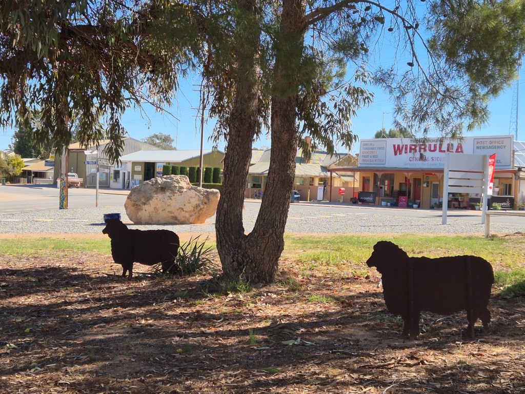 Most of you will know that the area we were travelling though is wheat and sheep country. An area thought to be very productive. Normally at this time of the year its green and lush in the fields and cattle and sheep are abundant. Well this year it was gut wrenching to see these normally productive areas barren and devoid of any wild life…no I lie… there was one group of about 5 cattle with a huge mound of hay beside them. Thats it! Oh yes …two sheep…but hang on are they just metal cutouts of what should be abundant?