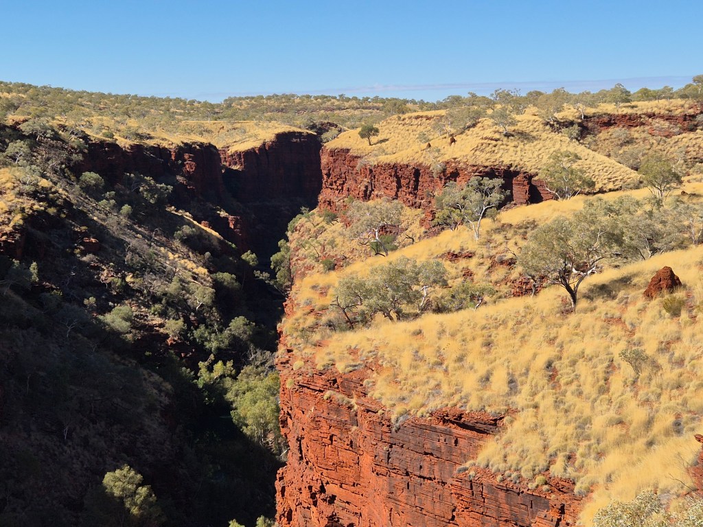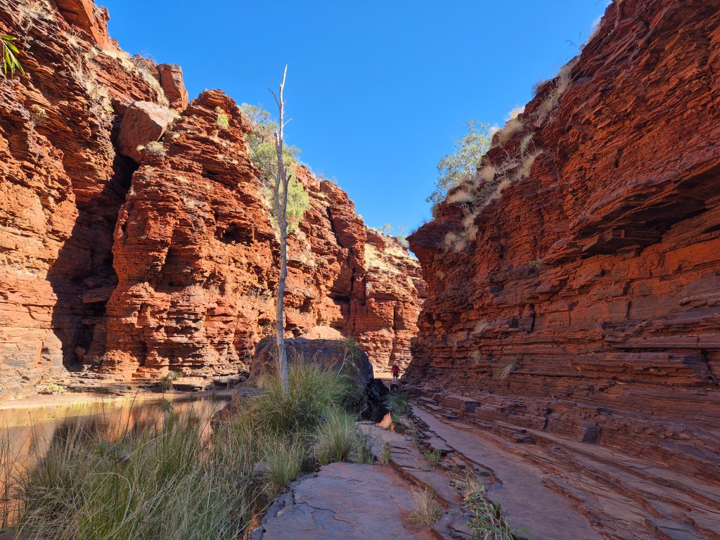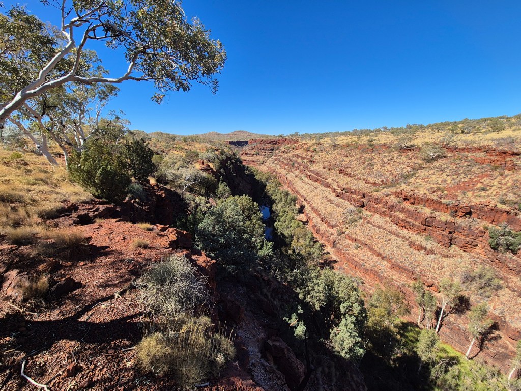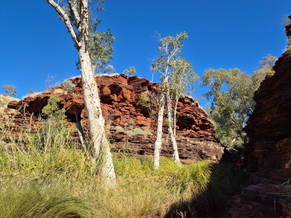 Sadly we did not have time to scramble down into the valley as we had a date with Kalamina Gorge. It’s been many years since we were in the Hamersley Range and I confess I had forgotten what Kalamina Gorge was like…silly me. How spectacular! Now if you look closely, you can see my friend negotiating the rocky areas. Returning we were delighted to see some huge ancient Paperbark Trees in the valley.