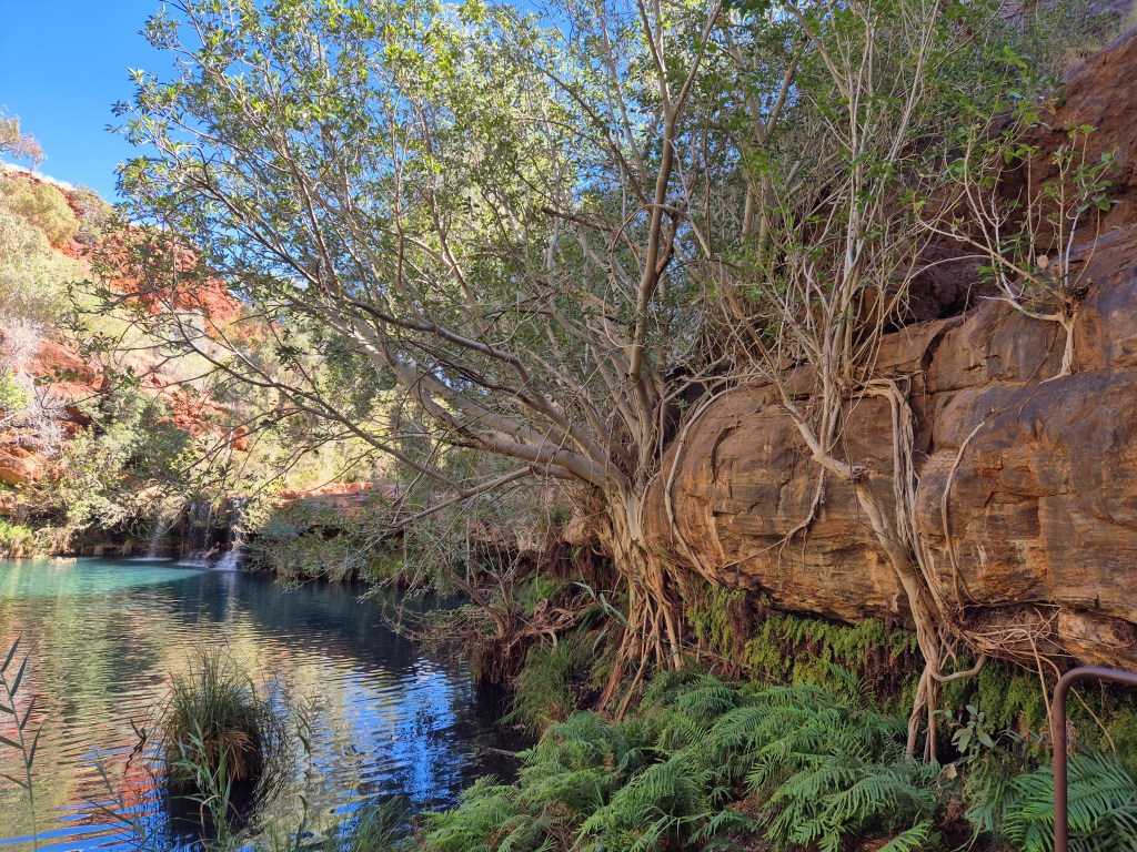 Onto the falls and it was gratifying to see that stairs had replaced scrambling to the pool below. That is a million (or so it seemed) of them…that will be great on the way back. Disappointingly though we discovered that the place resembled a town pool rather than scenic location. Indeed, it seems to me that the whole of the Pilbara is just one swimming location after another and that this is the main goal of the trip for many. To be fair, it is a swim in a nice locale.