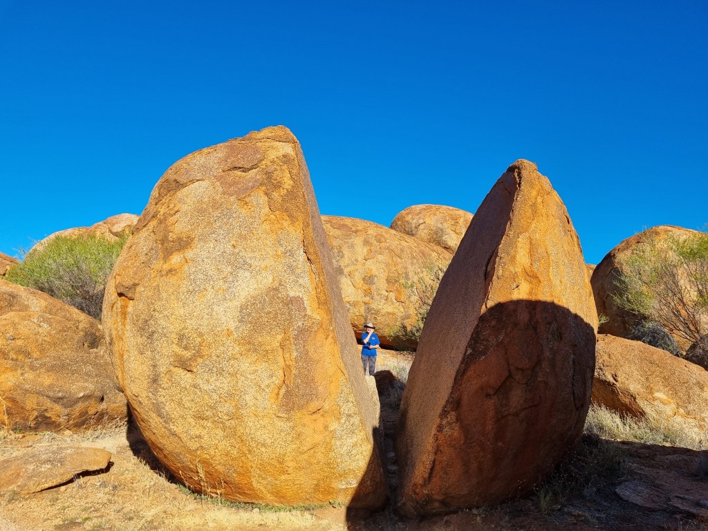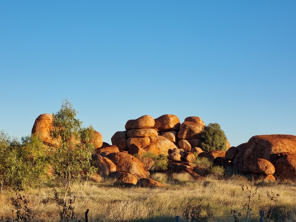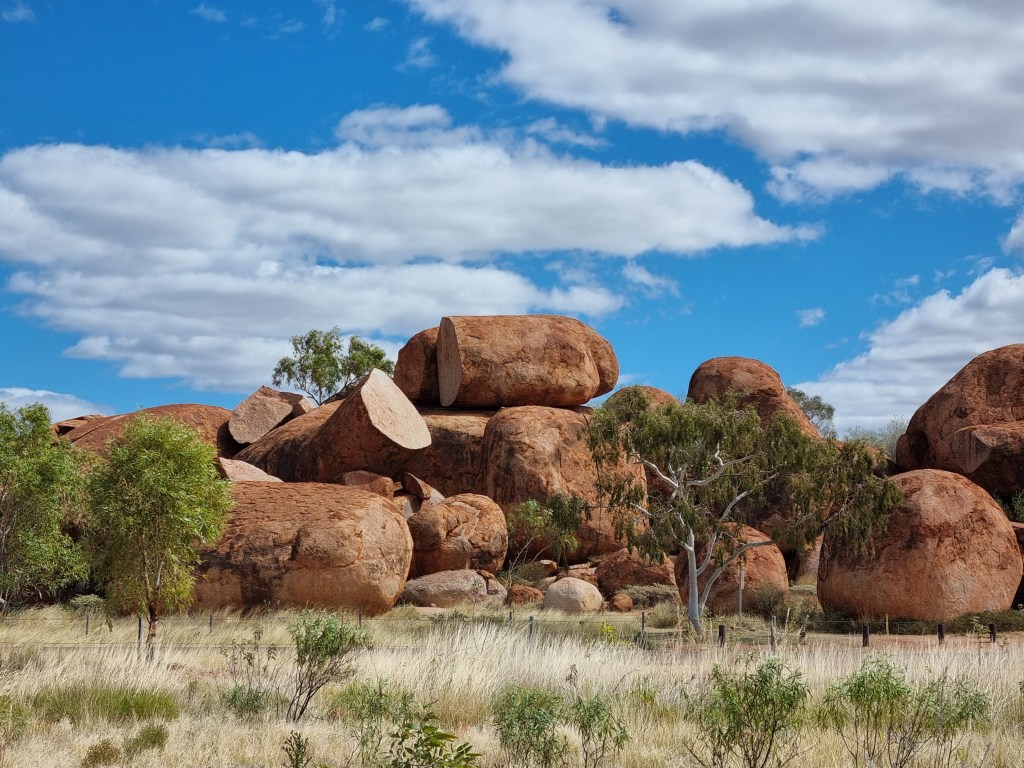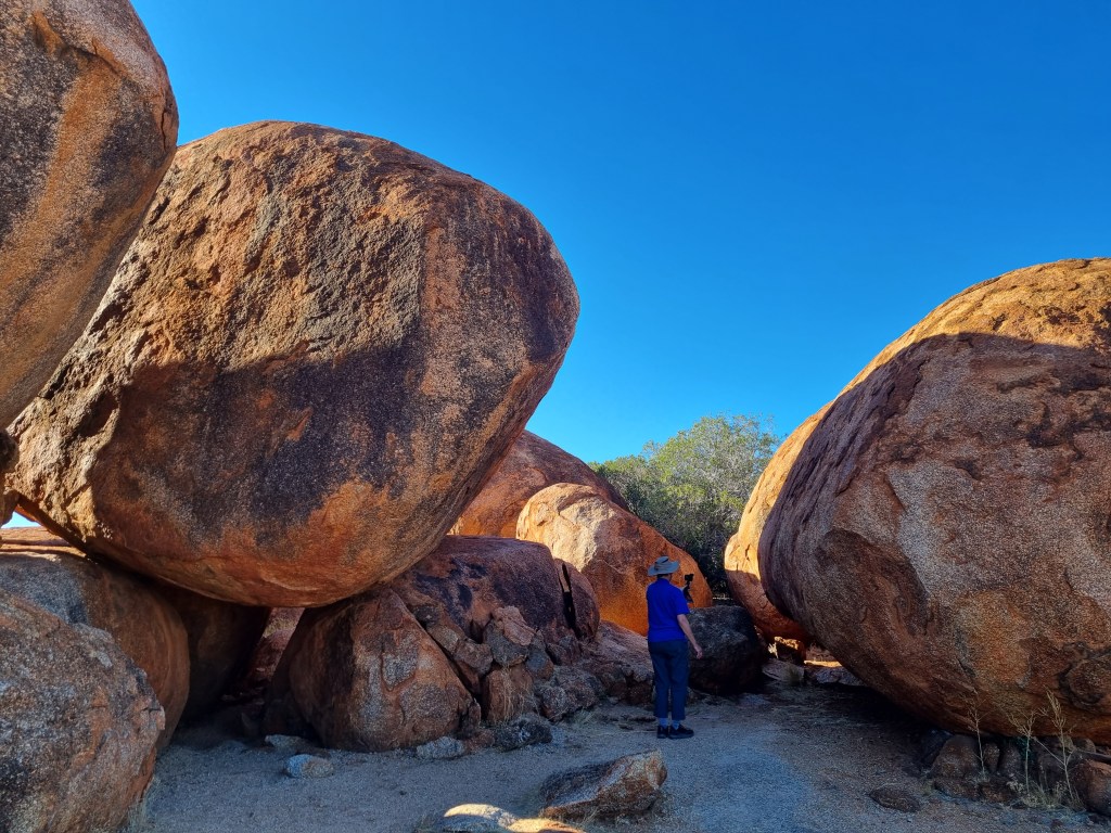 Heading Northward the next point of interest was the Devils Marbles, the remnants of granite outcrops, the bulk of which still lies underground. Kilometres of marbles, some teetering on top of others are scattered around and are quite stunning to behold.