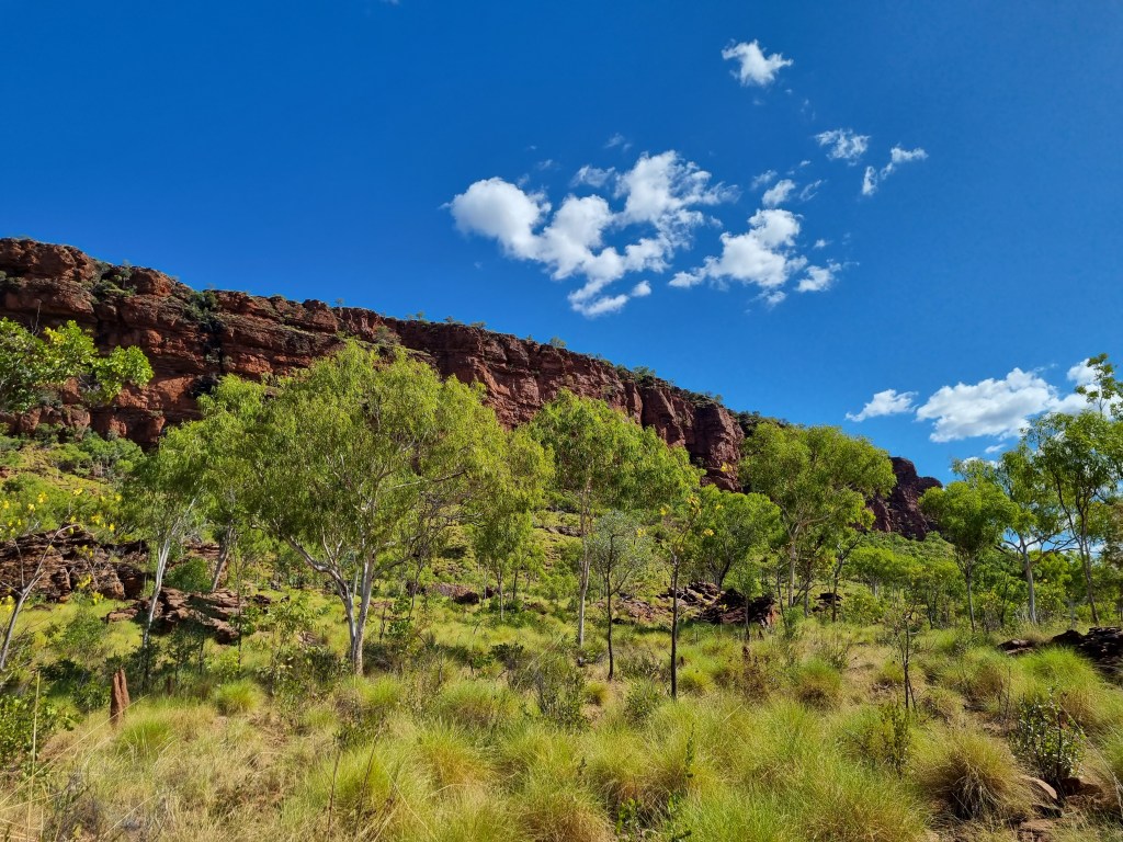 Masses of medium sized gums and spinifex populates this grassland, including pristine white ghost gums. We are also pleased to see vast areas of Kapok trees, some with fruit and a signature tree of Western Australia the Boab. Even one or two Palms…how delightful! By now it’s about 30deg and we arrive at Timber creek to camp.
