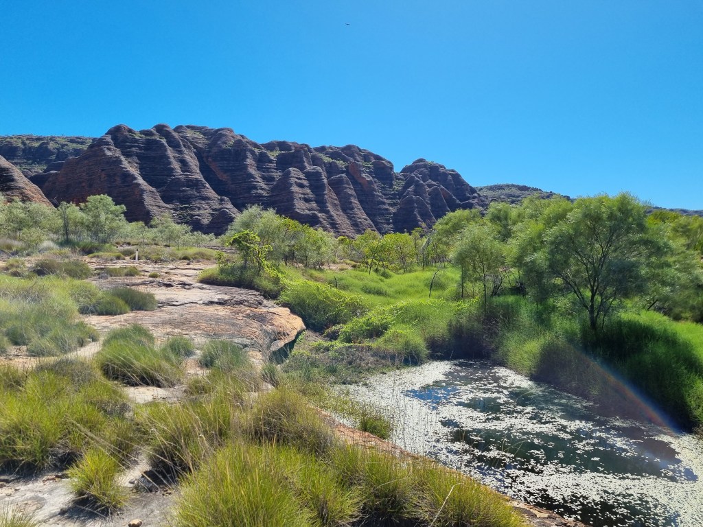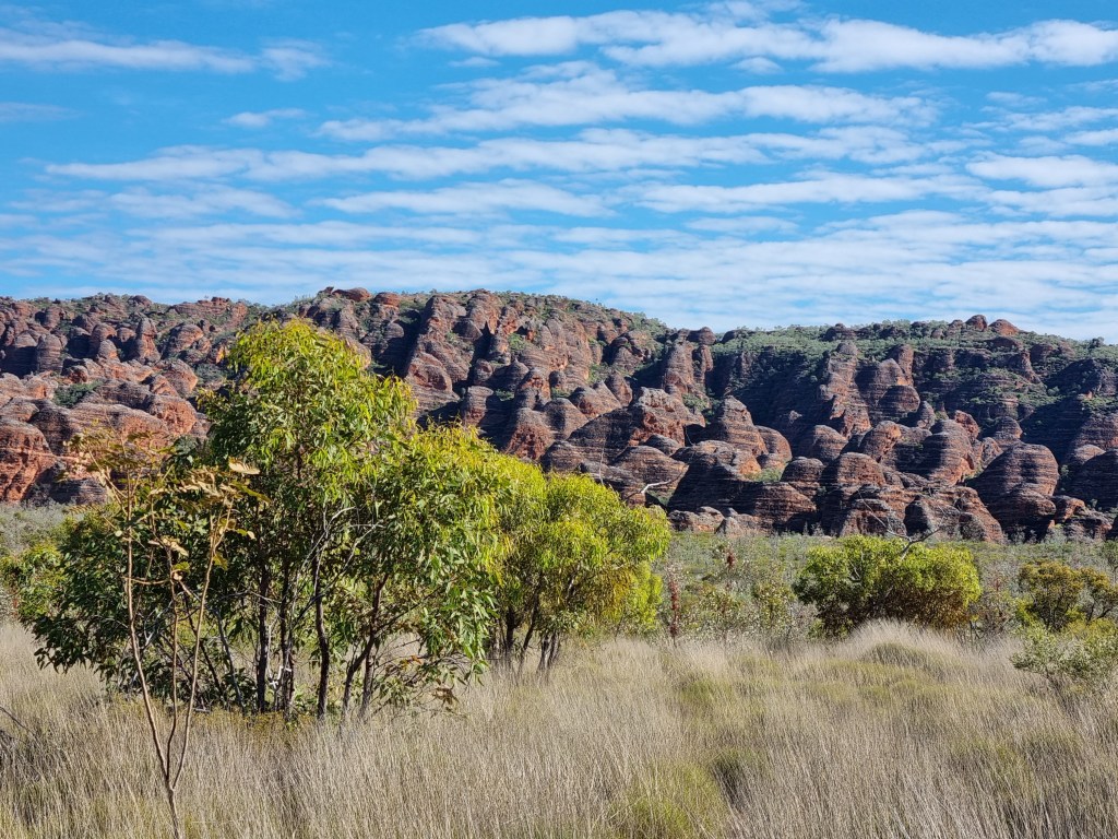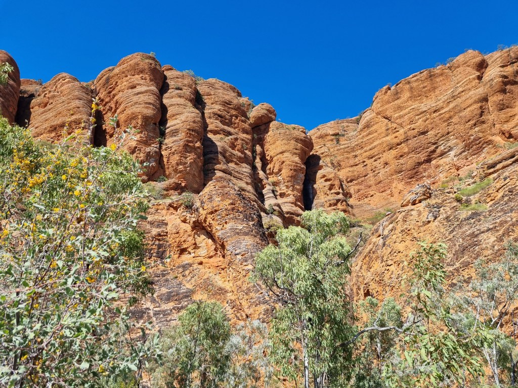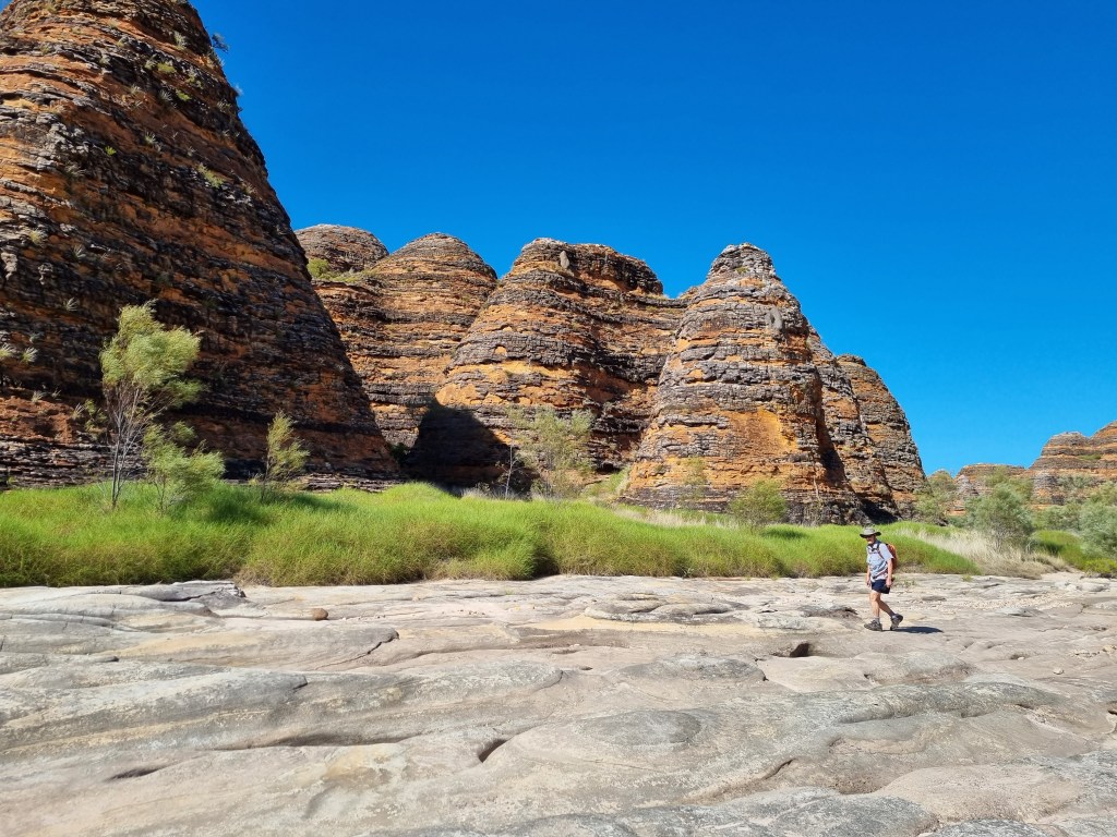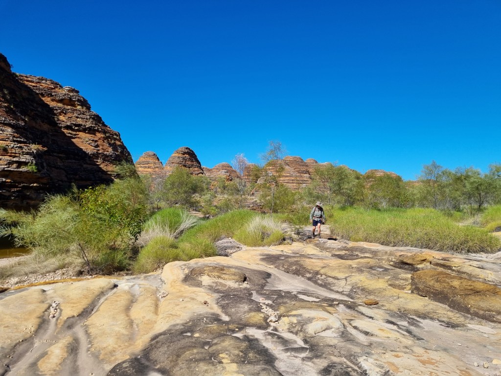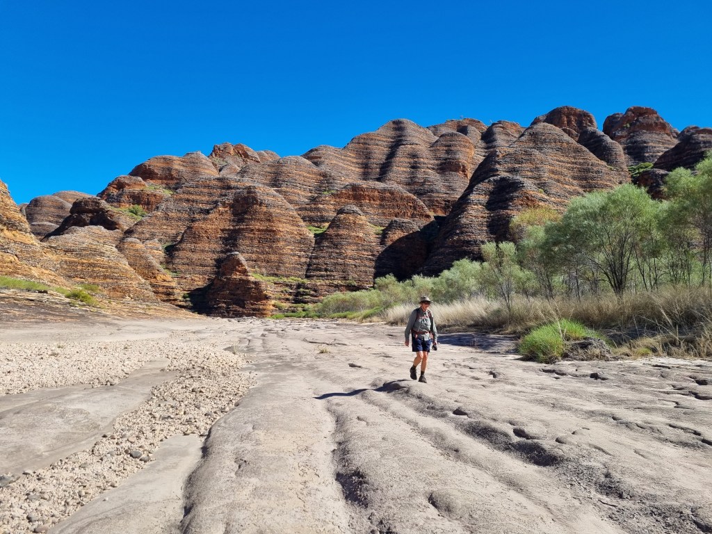 Purnululu is an amazing place as its foundations were laid down 360 million years ago. Over time deposits of sandstone and conglomerate uplifted and were then incised by flood waters. The resulting deep gorges are in evidence. The thing that confronts the senses are the huge and imposing escarpments and rocky outcrops that rise to 200 metres above the surrounding plains.
