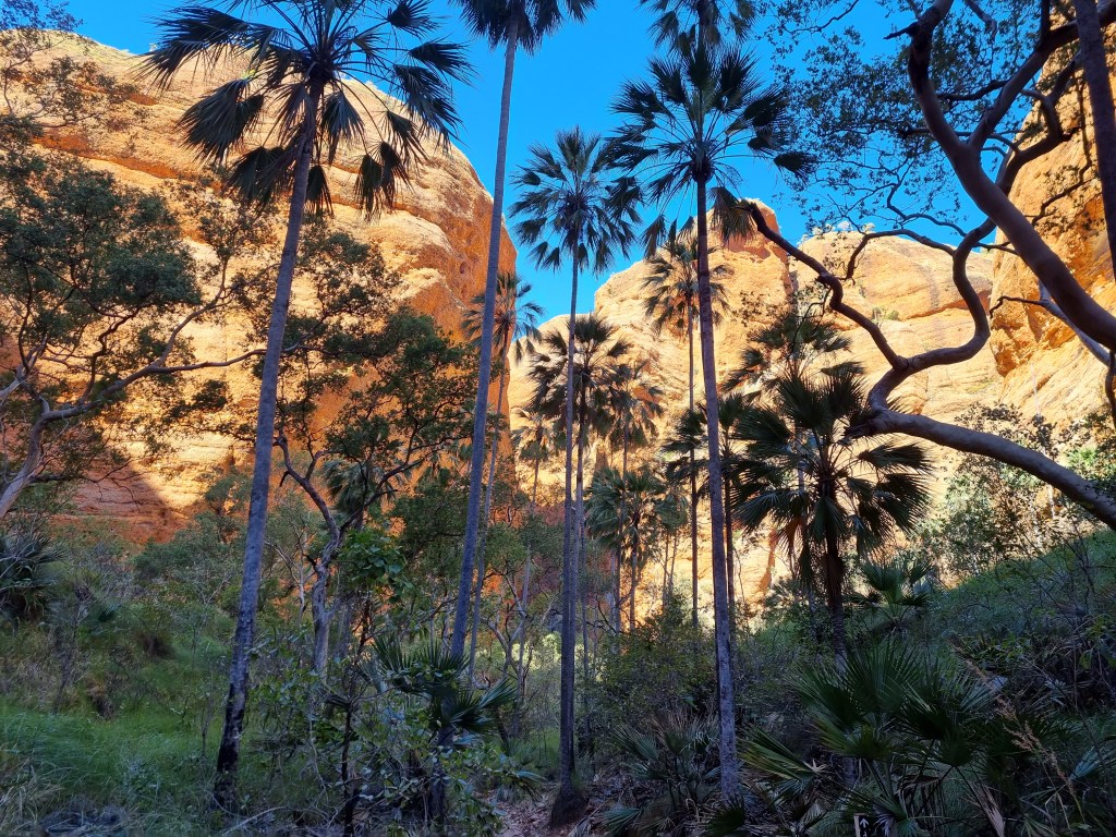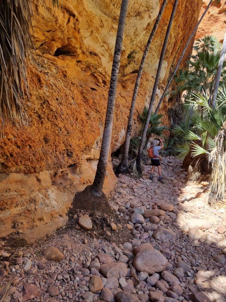 There is unique history here for us personally as our friends and a single ranger were the only white people in the Bungle Bungles then. It had not long been opened and we were keen to see it. He came rushing over to us when we arrived and said he had discovered something amazing and gave us a mud map. This we followed the next day and after quite some time, and lots of boulder scrambling were thrilled to see such a beautiful sight…which we called Phantoms cave. It was more like a cathedral really with an inwardly veering cliffs towards the cave. On the ground were hundreds of baby palms and the area felt pristine and sacred. Be assured we were very careful to traverse well away from the palms to enter the cave. Now, at last we have the chance to revisit this special place, which we captured then on Super 8. This has since been digitised and we watched it before we left for this trip.