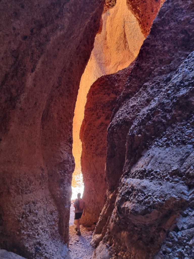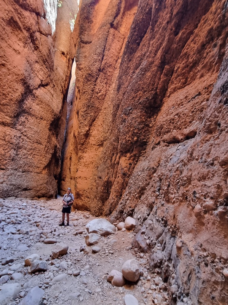 Getting closer to the chasm the cliffs pull in and then we enter a long chasm and after some distance arrive at an amphitheatre which, as its near midday lights boldly soon after we enter it. On the right picture you can see where Judy moves from the chasm into the amphitheatre. But when it lights it’s far too bright to take any pictures until we move through past it and look back. The very end of this huge chasm ends in a rock fall which may be interesting on the other side, but which I have no intention of scrambling over…leave that to other more adventurous folk.