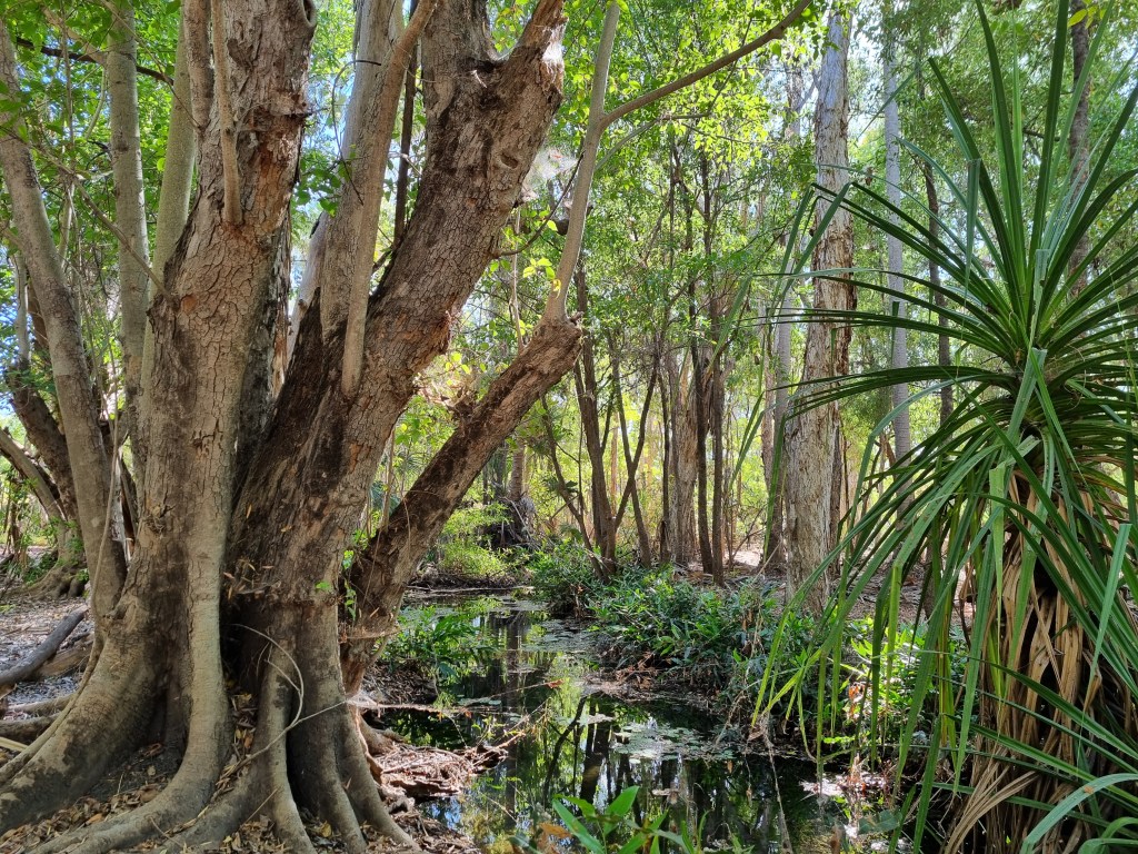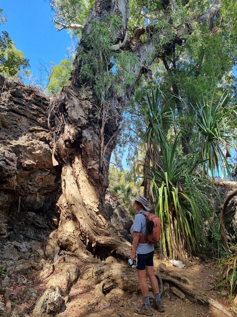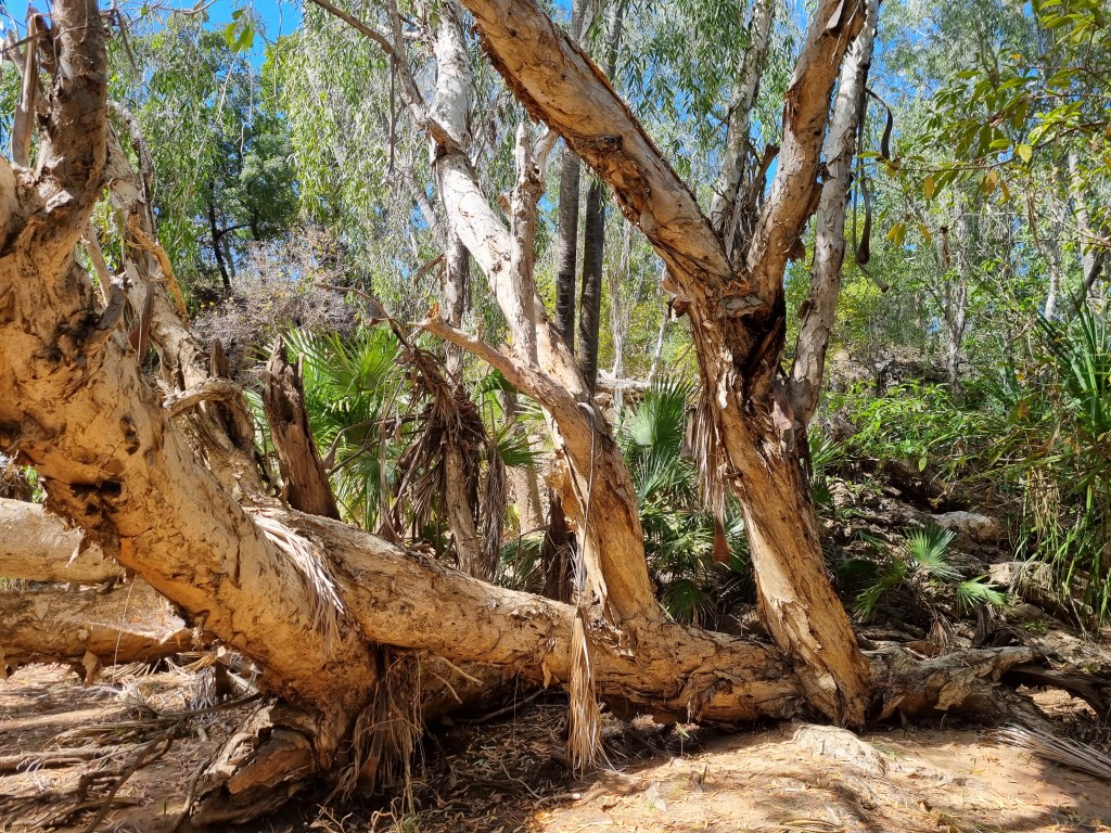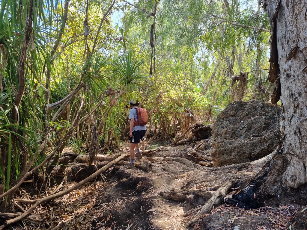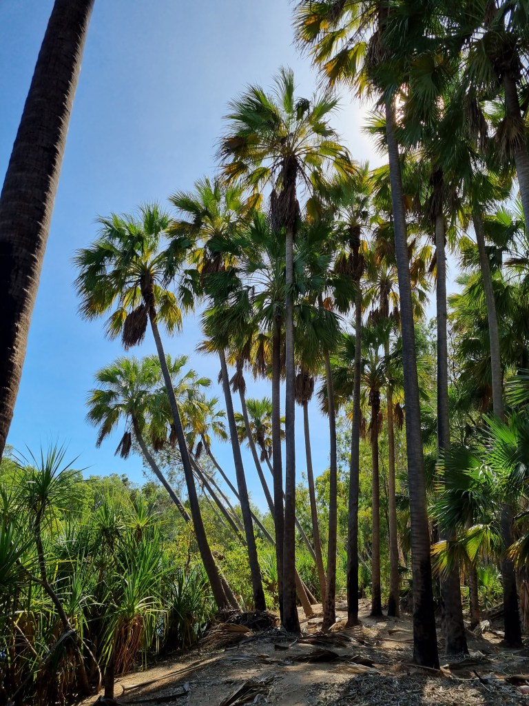 Walking past termite mounds we enter precincts of Palms and beautiful and some clearly very old Paperbark trees. They are just huge, and apparently their bark was used extensively to store food eons ago.