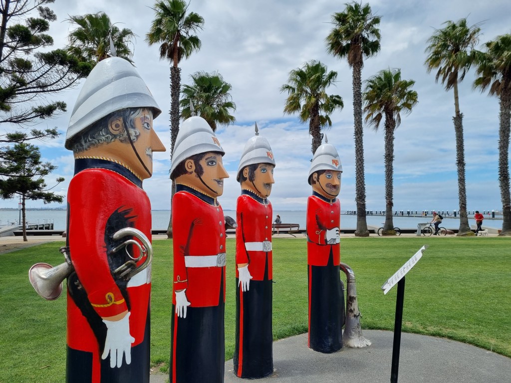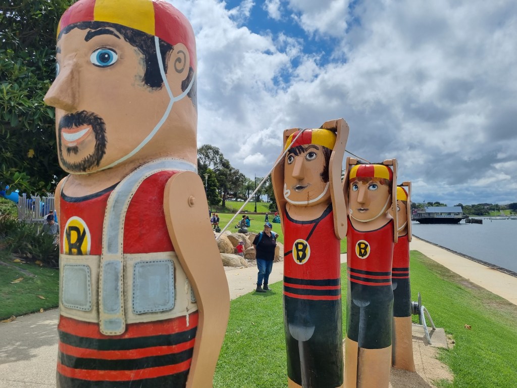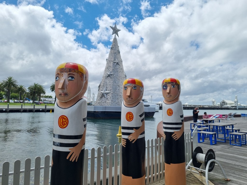 But before loading we spend a night in Geelong and enjoy an afternoon visiting some of the 40 odd Baywalk Bollards on the forshore. These, together with a wonderful playground for children, a ferris wheel and skatepark etc form an entertainment hub for them. Clearly it’s very popular.