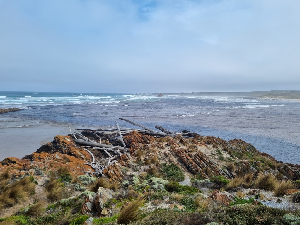 As planned we crawl out of bed at dawn both because of the forecast and as a direct result of gale force winds that have lashed camp all night. By 0800 all our gear is packed in the vehicles and we are having breky in the camp kitchen. We figure the Bay of Fires should be really picturesque with a weather front looming. En route its both moody and picturesque.