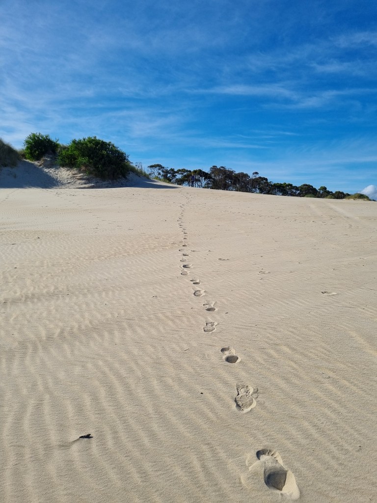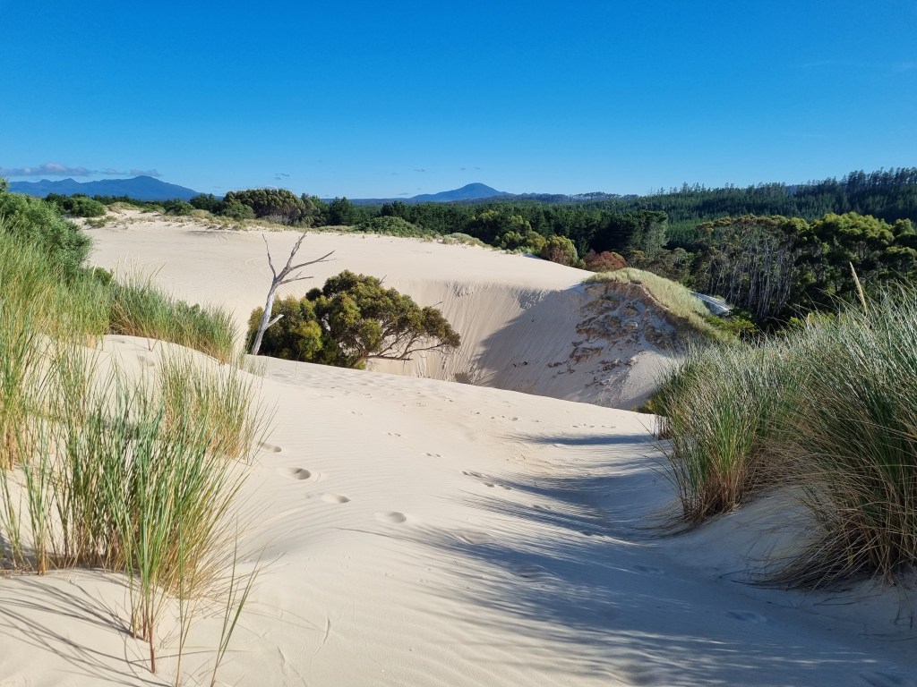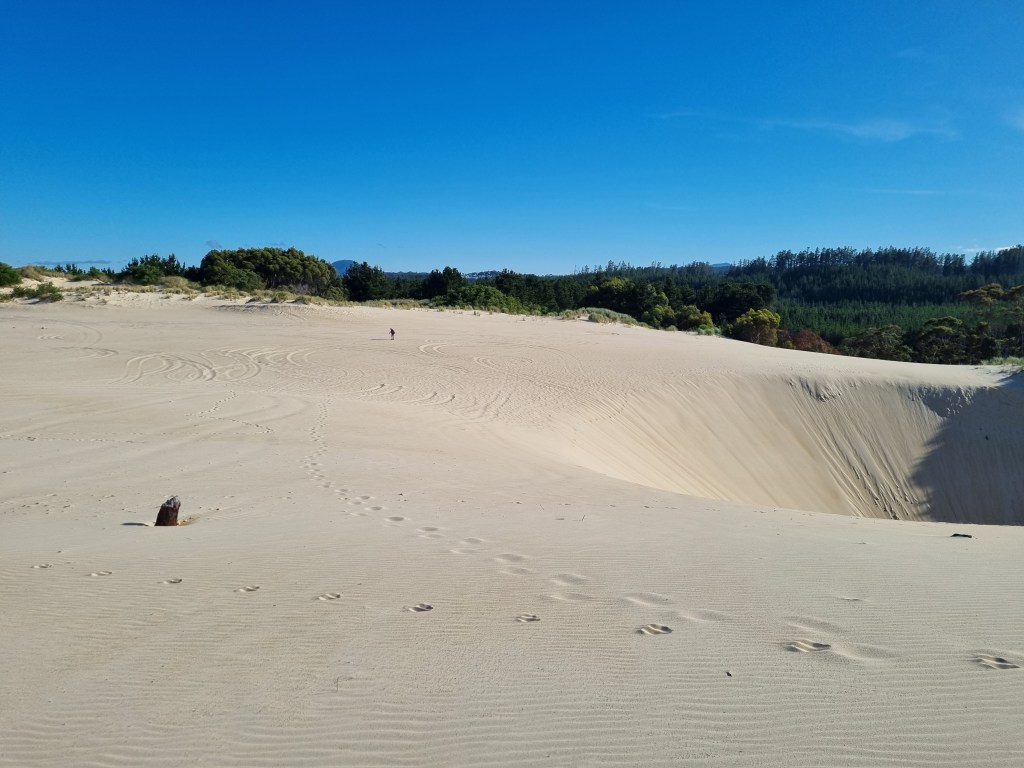 Further down we come to the pretty town of Strahan and to an attraction we were keen to revisit, the Henty dunes. These amazing dunes are upwards of 30 metres tall and stretch 15kms along the coast. Judy and my sister are pictured …do you see them?