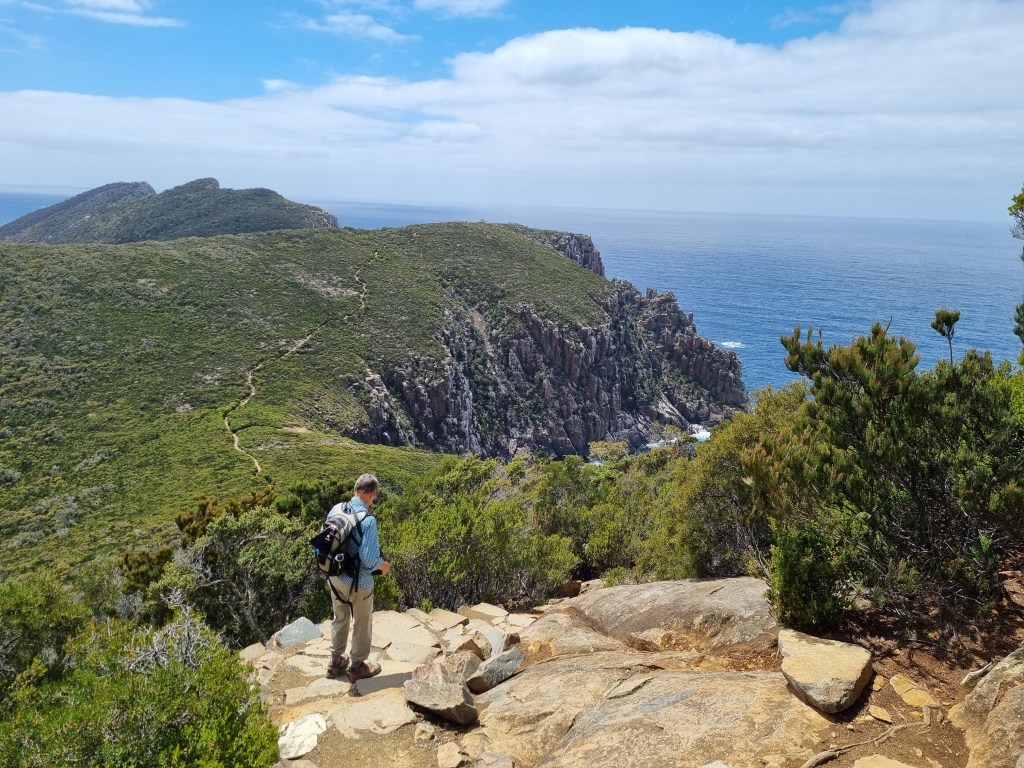 Cape Hauy sounded like a good start and we set out in high spirits to discover to our horror that the old rather manageable track had been reformed in the making of the 3 Capes Track. We were confronted with thousands of steps to be tramped up and down to get the views we were looking for. Truly a nightmare for all bar the fitness freaks looking for pain. Never the less we did get some great views of the dolerite columns.