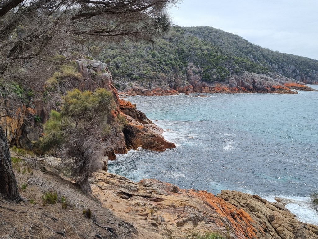 Heavy rain develops overnight and the morning is somewhat gloomy. So rather than walking to the Wineglass Bay lookout and beyond, we decide to head to the Tourville lighthouse. In my ignorance I just assumed we would end up at a cute beach for a wander. But again the magesty of the Tasmanian coast line asserts itself and we are provided wonderful coastal vistas both to the South (left) and North (right) of the lighthouse.