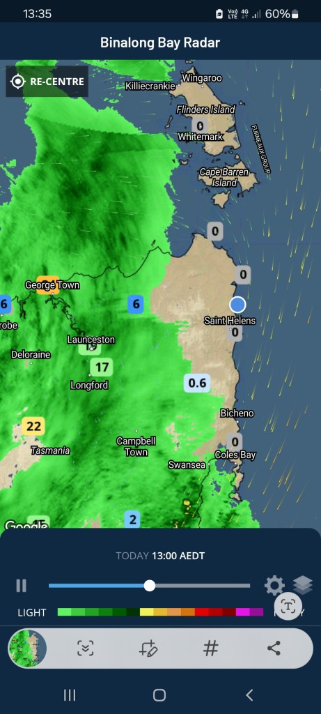 Funnily enough rain fails to appear and looking at the radar map we see why later on. St Helens, our target, seems to be free of the weather front dominating Tasmania whilst we roam around. How blessed are we…